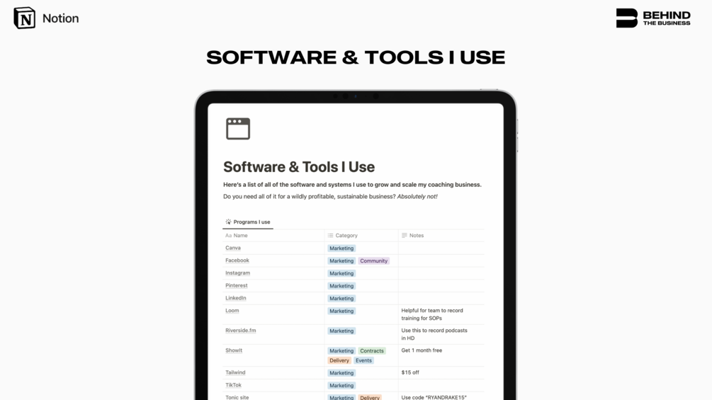 You'll get access to a Notion file listing all of my software and tools. You can duplicate the file for yourself to use!